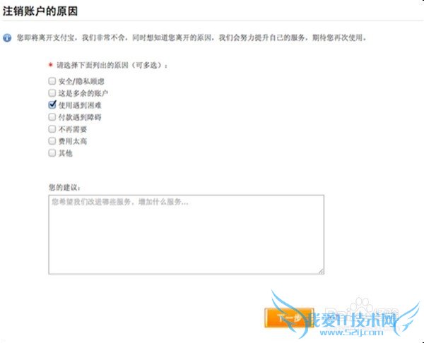 选择注销原因,点击【下一步】,注销原因选择为必填,【您的建议】可选填。