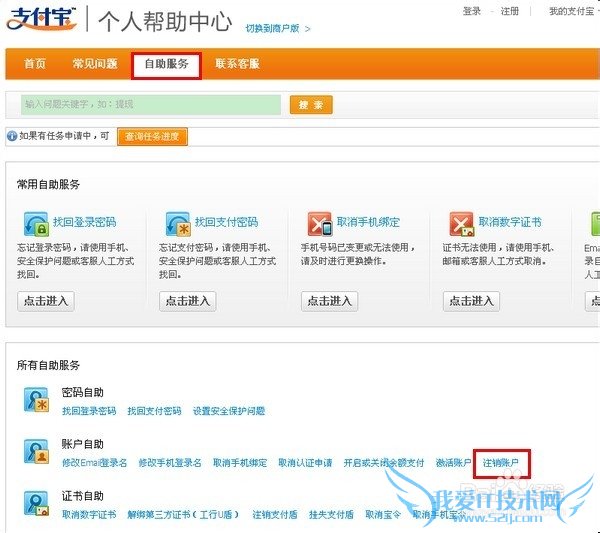 在支付宝个人【帮助中心】——【自助服务】,点击【注销账户】,如未登录支付宝账户会提示您先登录账户(电脑端打开支付宝首页,需要用手机扫描二维码登录)