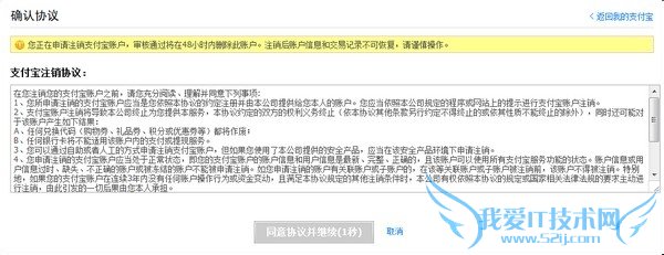 登录账户后系统会自动检测账户安全服务环境,如果不符合会报错:如数字证书用户未安装证书、如账户被冻结,或者是支付宝账户未激活。系统检测账户符合安全服务环境,进入协议页面,有5秒倒计时,5秒后才能点击【同意协议并继续】(点击【取消】则会退出注销流程,返回自助服务)