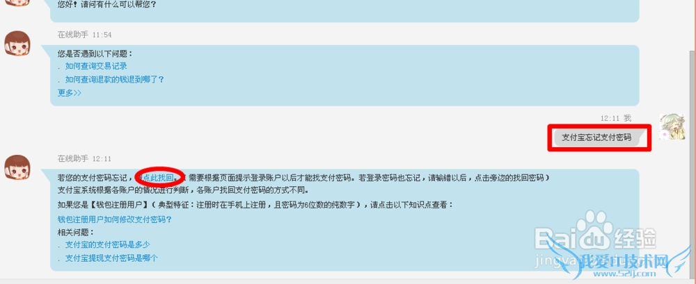 2.输入问题“支付宝忘记支付密码”,小助手会回复你,点击回复里面的“点此找回”