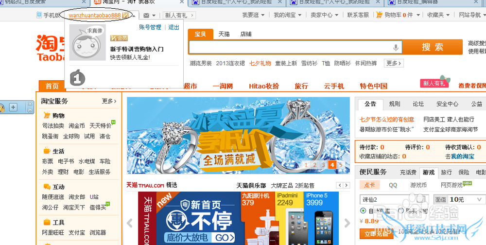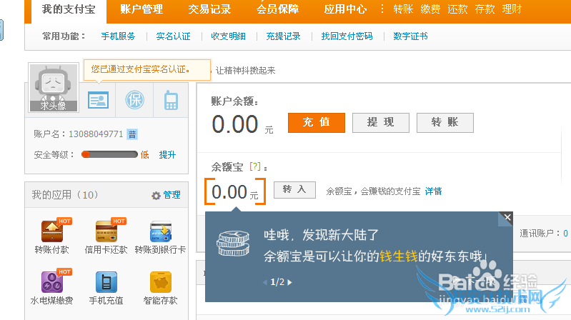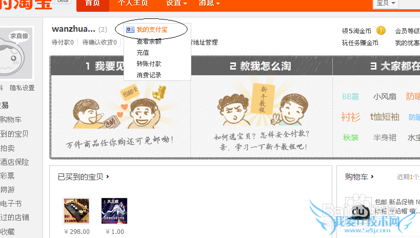 使用邮箱验证就可以了,如果你告诉我你连邮箱都不会注册。那您还是另请高明吧。注册成功后下一步就是登陆你的淘宝号点击左上角的用户名进入支付宝页面。