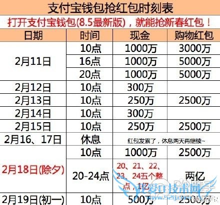 支付宝抢红包时间表: