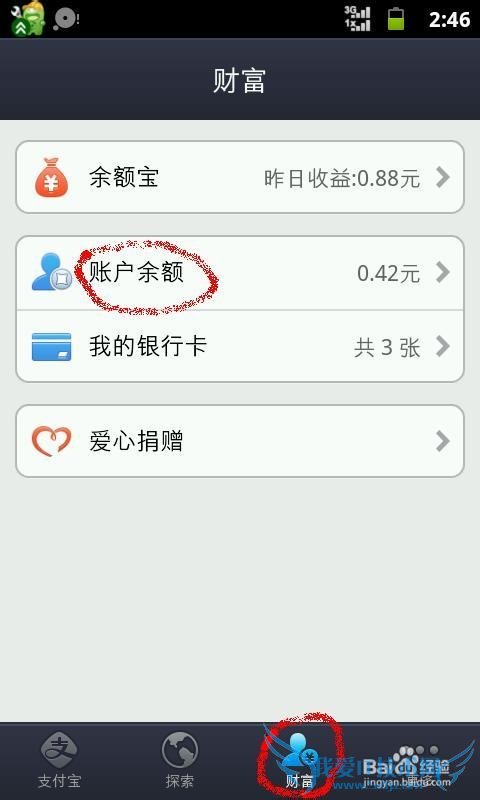 点击下方的“财富” 再点击“账户余额”,参考下图: