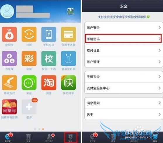 1、登录支付宝钱包,点击【安全】——【手机密码】;