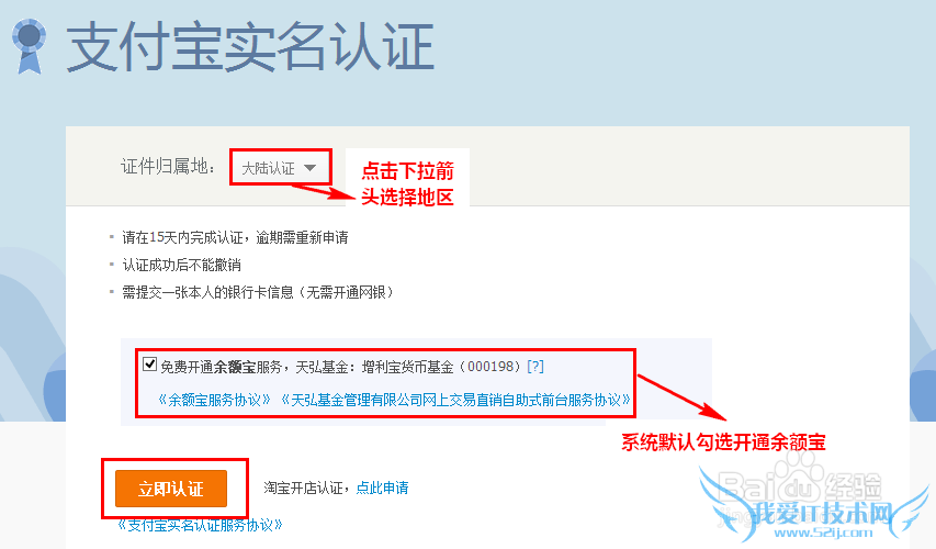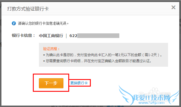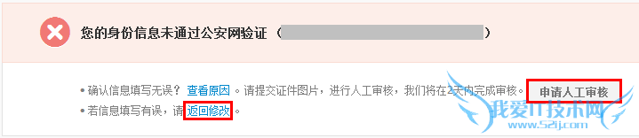 1)若身份信息未通过验证,用户需点击【申请人工审核】提交双证由支付宝进行人工审核(审核时间:2天)。审核通过后您可以继续申请认证,请再次登录支付宝账户,点击【实名认证】跳转至第五步流程进行银行卡验证。