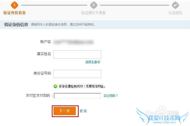 2、填写身份证信息、支付密码,点击【下一步】进行身份验证;