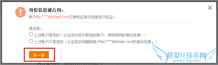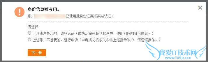 B:被其他身份验证通过的账户占用:如选择占用账户是自己的,则本账户与占用账户关联成功,占用账户则为主账户;若选择占用不是自己的,本账户可继续实名认证,且完成对占用账户身份信息的删除。