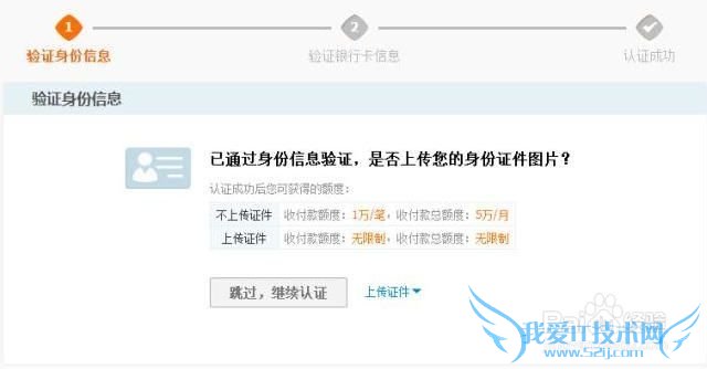 4、通过身份信息验证,提示您是否上传身份证件图片,选择【跳过,继续认证】:不上传证件,收款额度2万元/月,收付款总额度5万元/月;选择【上传证件】:收付款额度无限制;
