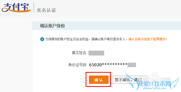 3、请确认姓名和身份证号码无误,点击【确定】,确认后身份信息不能修改;若点击【暂不确认,跳过】,页面会回到【我的支付宝】首页,相当于用户并没有通过身份验证。