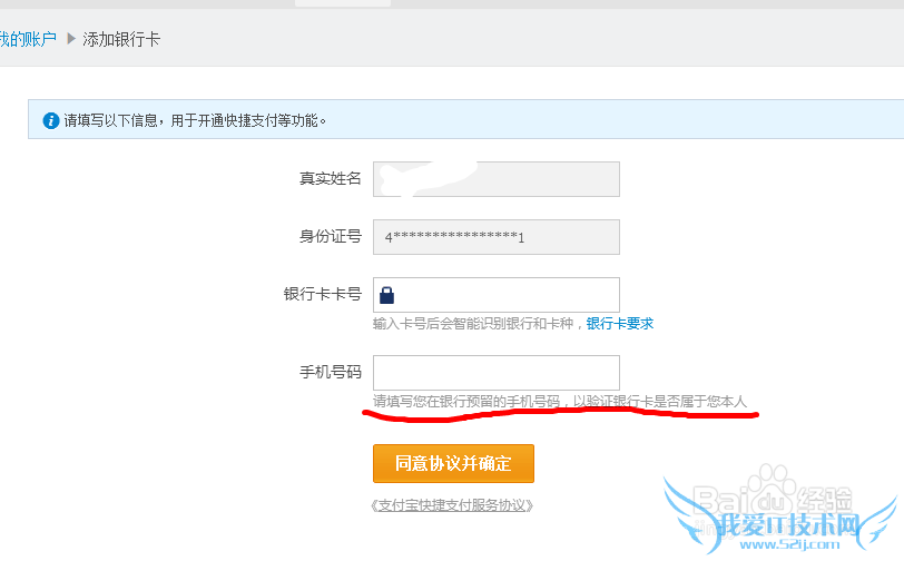 3.按要求填入信息,注意此银行卡必须和支付宝名字一致,而且你一定要记得办银行卡时填的预留手机号码,如果手机号码换了或者不记得或者开卡时没有填,请携带身份证前往营业网点更改。