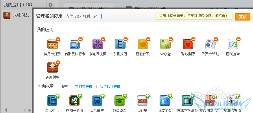 在我的应用里边可以添加很多常用功能,包括转账付款。