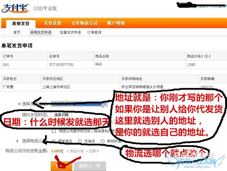再点击“我要发货”里面有“单笔发货申请”和“批量发货申请”分别点击进入如下图所示