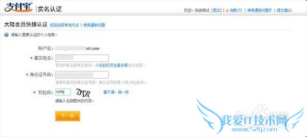 填写认证用户的姓名及身份证证件号码,点击【下一步】;