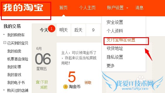 2. 请依次找到“我的淘宝”——“账户设置”——“支付宝绑定设置”。