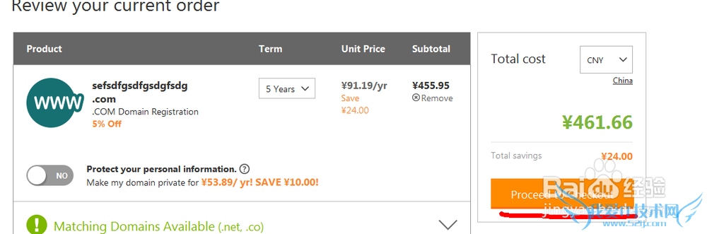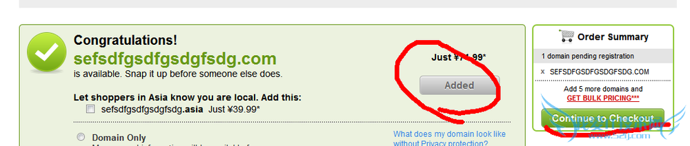然后选择域名,ADDED TO CART 然后checkout,后面不要选其他的,点continue就行,好了,到的结账页面,然后结账,选择支付宝支付,就会跳转到支付宝,然后支付完成跳转回去,就完成了,