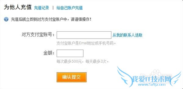 3、填写他人的支付宝账户和充值金额;