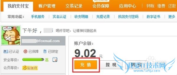 1、登录支付宝账户,点击【充值】;