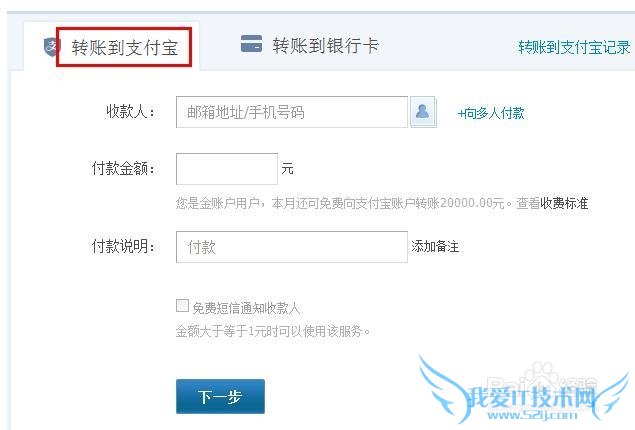 如果是转到别人的支付宝,就选择转账到支付宝选项,填写收款人账号及付款金额点下一步。如图:
