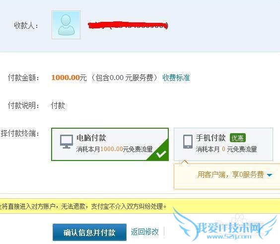 确认收款人信息,然后点付款确定。(付款方式有两种:电脑付款及手机付款)如图: