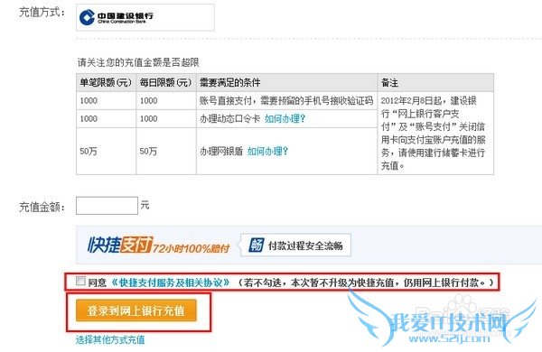 3、输入充值金额,系统默认勾选同意【快捷支付服务及服务协议】,需要取消勾选后,才可以显示点击【登录到网上银行充值】入口,点击即可;(如您不去勾选,即可开通建设银行快捷支付(含卡通)服务功能,开通之后即可使用快捷支付功能进行账户充值。