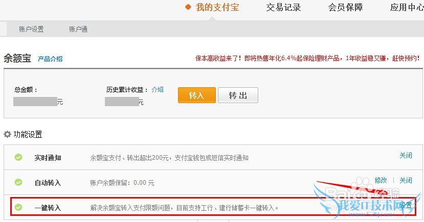 在“功能设置”区域,单击如下图的“一键转入”的【设置】(按灰色字体提示,目前仅支持工行和建行储蓄卡)