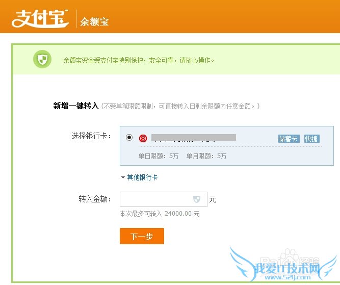【注意事项】如第二步一键转入功能的提示,目前支付宝只支持“工行,建行”使用该功能,所以试用前请确认开户行是否支持。