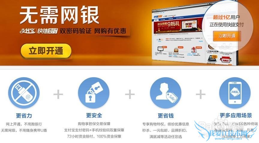 快捷支付(含卡通)是支付宝联合各大银行推出的全新最安全、轻松的支付方式。付款时无需登录网上银行,只需关联您的信用卡或者借记卡,每次付款时只需输入支付宝支付密码即可完成付款。安全:3大安全体系设计,让您安心购物便捷:3步在线支付流程,让您轻松购物保障:72小时完成赔付,让您放心购物。现在小编教你如何开通支付宝快捷支付功能。