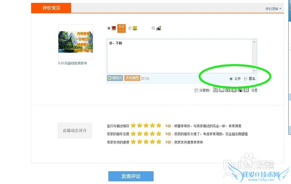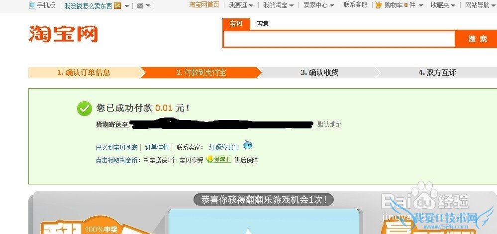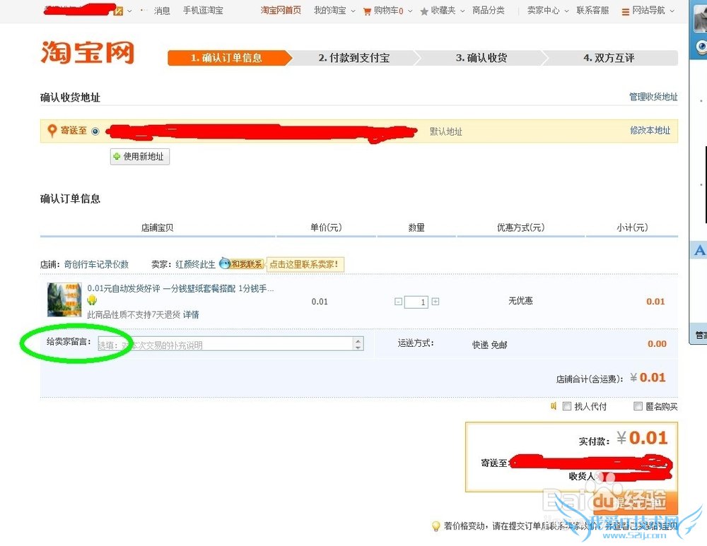 点击【立即购买】 当然了你也可以先问问卖家还有疑问的问题,一定要提前问清楚。大家可以看到我这是个淘宝新号,点了立即购买它弹出来一个使用新地址的弹窗,填好或选择收货地址电话什么的 然后 【确定】下一步如图 绿色圈内可给卖家留言,例如什么快递呀要什么颜色啊之类的