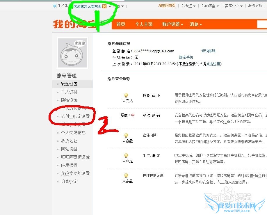 看图先把鼠标放到你淘宝用户名上(绿色圈那里)看到出现【账号管理】然后点账号管理进去。进去后找【支付宝绑定设置】在红色圈那里