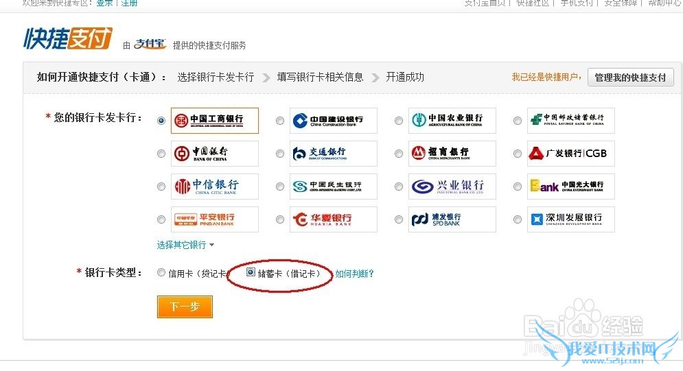 然后按页面提示选择你的银行卡发卡行,找不到你的银行下面有个【选择其他银行】一般都是可以找到到的。银行卡的银行预留号码一定是你现在用的手机号,它会发验证码到你预留的手机上,如果你换手机号了建议你去银行柜台改改(不要钱要排队)。选好银行后选银行卡类型,这个都分的清吧,一般的都是储蓄卡(就是你要先存钱才能取钱的,一般工资卡都是借记卡) 下一步,按要求一个个的填好
