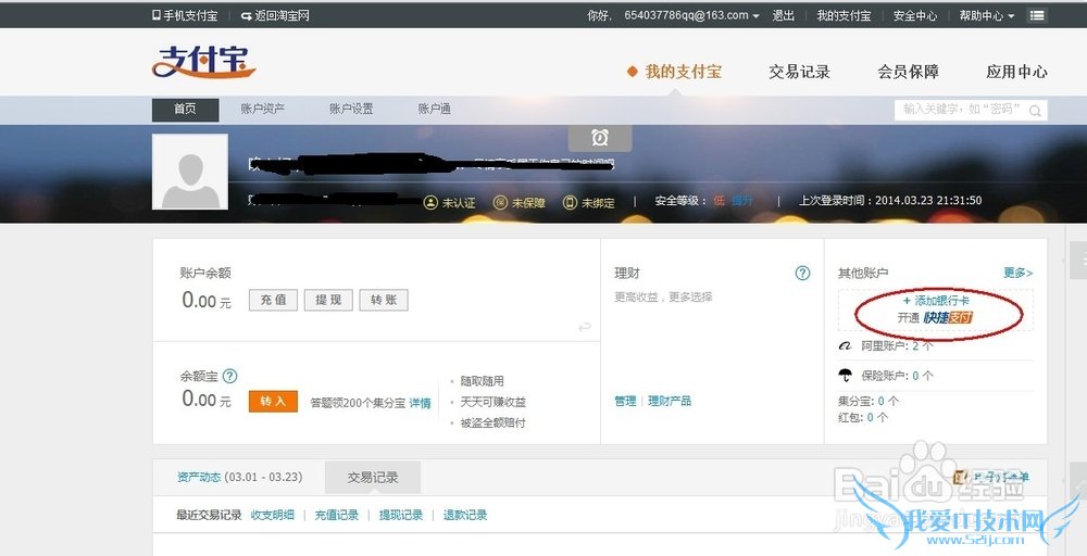 现在可以看到这个账户没有钱(也许你的账户有钱),不过不用管它 ,咱们来看这个红色圈里 点击添加银行卡