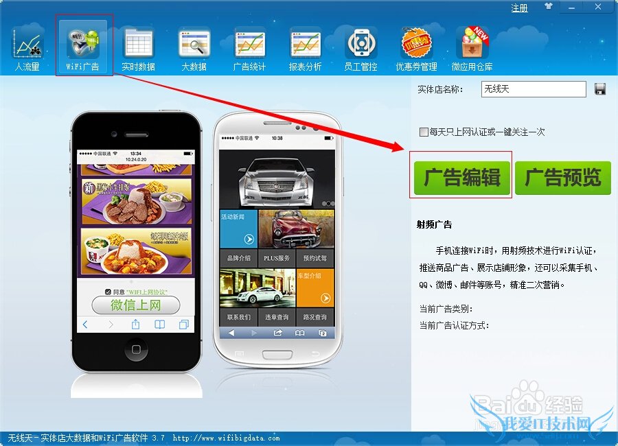 Step 1:打开软件后,点击“WiFi广告”-----“广告编辑”,出现如下界面: