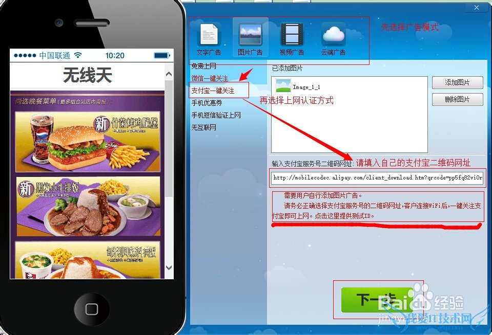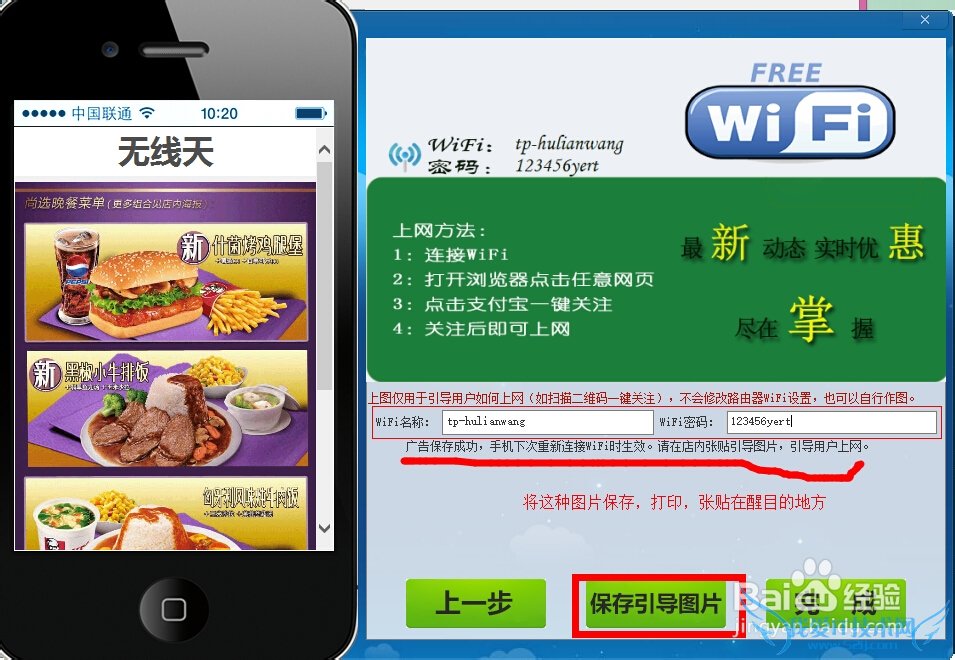 Step 3:测试,请保持,电脑,手机,在一个无线路由器下,电脑最好有线连接路由器,手机重新连接wifi(模拟用户进店),按照引导图片的方法上网。如果没有出现广告,请到官网上寻求技术支持吧。