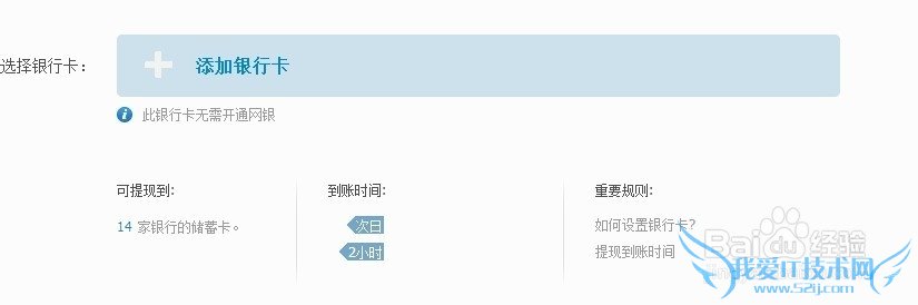 6、选择“提现”后,则弹出了如下界面的对话框,然后选择银行卡,如果应经添加过银行卡直接转账,如果没有添加过银行卡,点击添加银行卡然后,添加好银行卡后则可以进行转。次日到账免费,2小时内到账需收一定的手续费,如果用支付宝手机客户端则是免费。