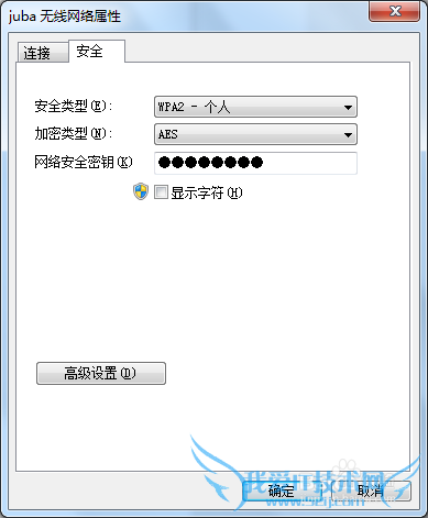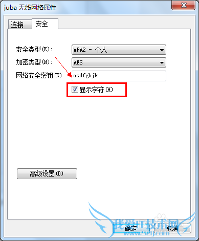 3.点击“属性”,在弹出的无线网络属性选项卡中,可以看到“网络安全密钥”为不可见模式,勾选“显示字符”选项即可查看当前无线网络密码。如下图所示