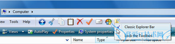 右击资源管理器工具栏的空白处,弹出一个菜单,勾选“ClassicExplorer Bar”菜单项,这样资源管理器上部就会多出一个XP那样的工具条行,该行左边是“文件(F) 编辑(E) 查看(V) 工具(T) 帮助(H)”菜单,右边有很多类似XP资源管理器那样的按钮;