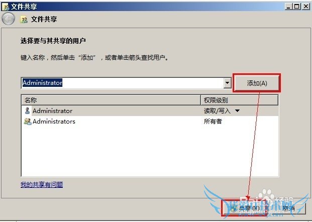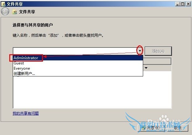 点击下拉按钮选择Administrator或guest用户,点添加。然后点击共享,完成文件夹共享设置。