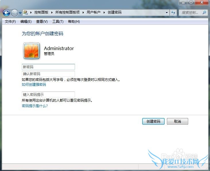四、进入后出现“为您的帐户创建密码”功能。在“新密码”窗输入你想设置的密码,在“确认新密码”窗,再次输入你所要设置的密码。然后点击“创建密码”按钮。