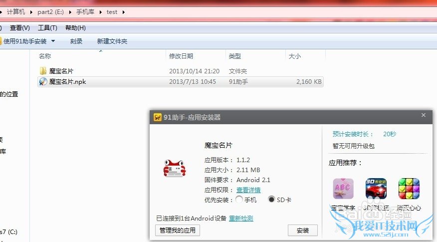 这种方式可以很方便的导出手机里的每一个软件及其数据,等手机刷机之后,重新连接上91助手,然后双击npk文件,即可进行安装,这时91会自动帮你装到手机里,如下图: