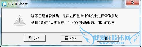 3、弹出程序已经准备就绪的提示框,此时选择重启即可进入备份阶段。“立即重启”、“手动重启”都可以,若暂时不需要备份则选择“取消”。
