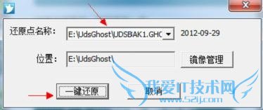 2、弹出还原系统提示框,选择原先的备份文件“UDSBAK1.GHO”,点击“一键还原”。