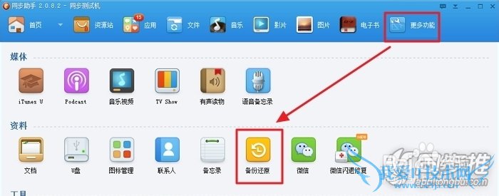 切换到“更多功能—备份还原”可读取之前用iTunes备份的内容。还可创建新备份,或者在原来备份的基础上,再增加备份的资料进去。