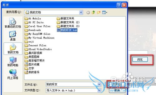 我们点“浏览”按钮,弹出窗口后,我们找到之前的备份聊天记录文件,点打开。