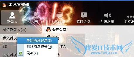 欢迎您访问我爱IT技术网,今天小编为你分享的电脑教程是:QQ2013怎么备份聊天记录,在平时使用电脑中总免不了某些软件的激活、甚至备份等,比如:辛辛苦苦写的程序没做好备份丢失了,那是很难受的事儿。本文针对这些诸多问题,由我爱IT技术网电脑教程小编,精心整理并收集网络上这些有用的知识分享给大家,注意知识来源于互联网,是有用的知识收集整理,如果你觉得有侵犯你的权利的,请你及时联系本站的相关负责人,我们会在第一时间为你处理,谢谢你的配合!