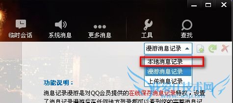 我们可以看到右上角下拉箭头的选择,这里我们如果以前向网上上传过消息记录,如果你要对上传的记录备份,可以选漫游消息记录,但“漫游聊天记录”是对QQ会员进行的服务。如果你要向网上上传聊天记录,希望你的聊天记录备份到QQ官方的服务器,就选“上传聊天记录”,可以按步骤进行操作。我们一般都选“本地消息记录”。我们这里讲的是对本地的聊天记录进行备份还原。