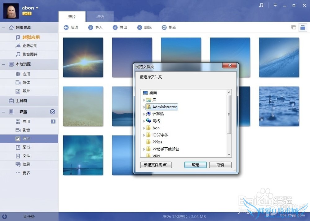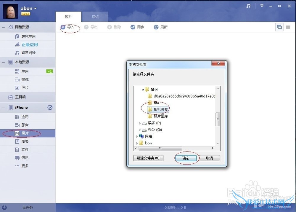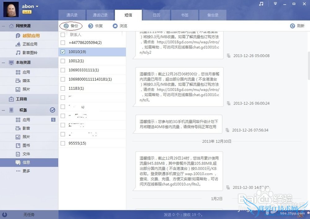 (3)照片、信息备份PP助手----照片(信息)--选择照片(通讯录、通话记录(需要越狱)、短信(无需要越狱,无法备份彩信与iMessage)--导出--选择保存的路径