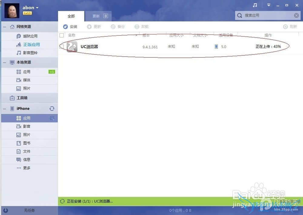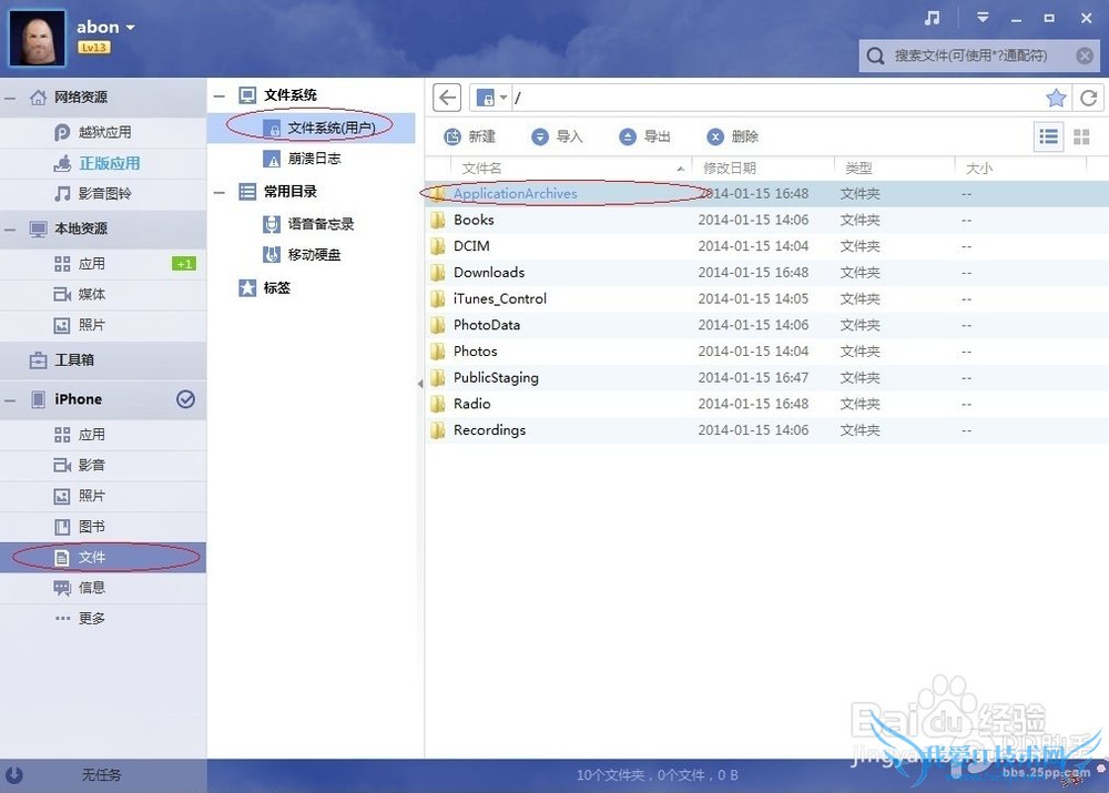 注意:使用PP助手备份应用程序请预留iOS设备上有足够的空间备份,因为PP助手备份应用程序时将应用程序一个一个在iOS设备上进行打包压缩完成后再保存到本地电脑上(操作好会自动删除设备上压缩文件进行下一程序打包压缩),所以请确保手机剩余空间是足够打包应用程序的大小,(如:备份到【无尽之剑2】,手机剩余的空间必须大于【无尽之剑2】容量)如果因为空间不足导致备份失败有可能残留失败文件在设备上,打开PP助手--文件--文件系统(用户)--“ApplicationArchives”文件夹,将文件夹删除就可以释放的。