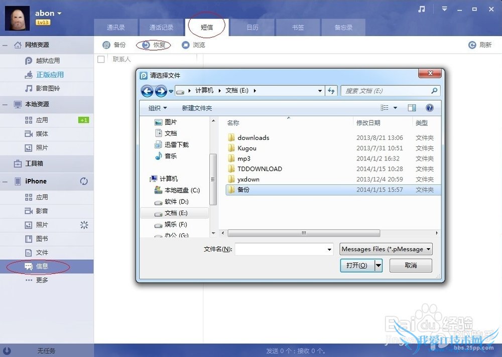 PP助手--音乐(铃声、视频、图书、照片、信息)--导入--选择备份的文件夹--选择还原文件