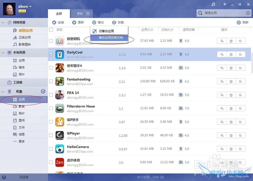 ②.PP助手备份手机其他内容:(1)程序备份PP助手--程序--选择应用程序--备份--选择【备份程序】或【备份程序及其文档】--选择保存的路径【备份程序及其文档】:可以备份应用程序的存档以及使用记录。