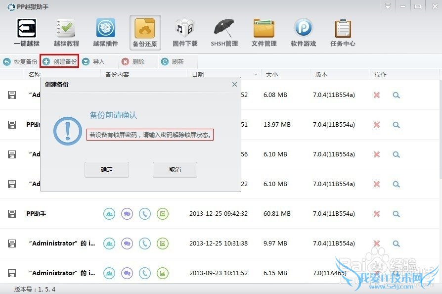 2.点击“创建备份”此时会提示如有锁屏密码请先取消锁屏密码再进行备份